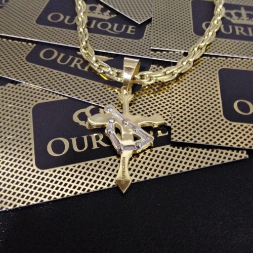 Pingente de cruz com Cristo e medalha São Bento de ouro 18k 15 gramas