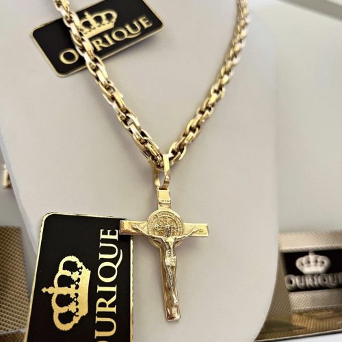 Conjunto de ouro amarelo 18k corrente trançada e pingente de cruz 3D 50 gramas